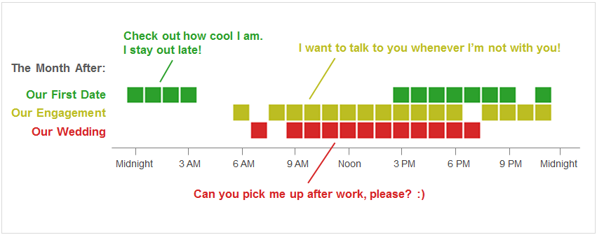 While we were dating, we started thinking about each other around 3pm in the afternoon and we’d send each other text messages until 3am in the morning. As a married couple, our texting schedule has pretty much flipped. We text all through the workday and never at night.